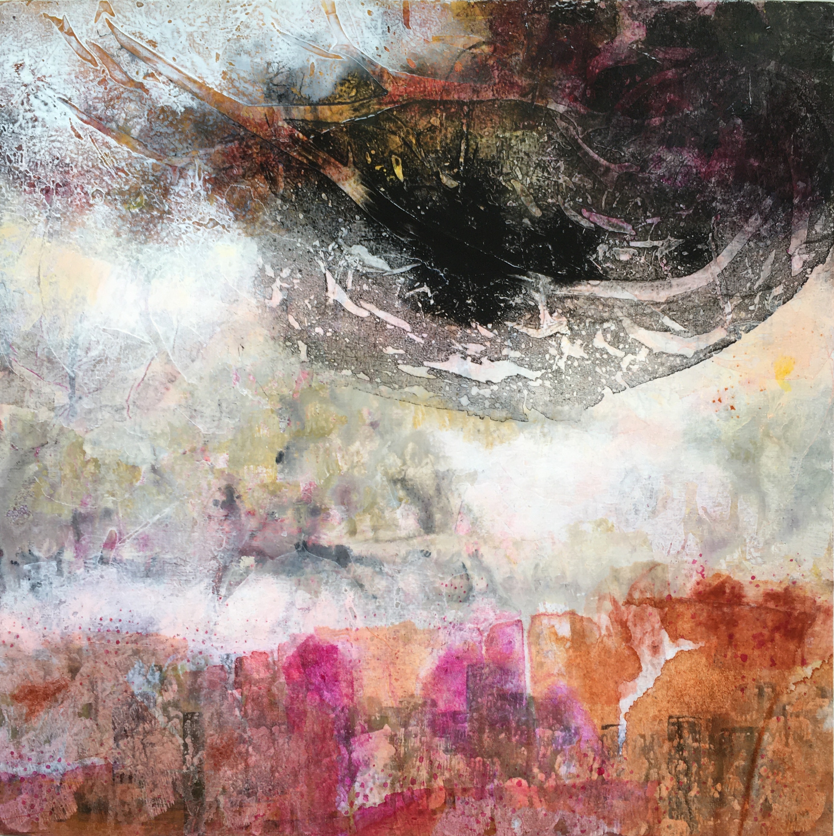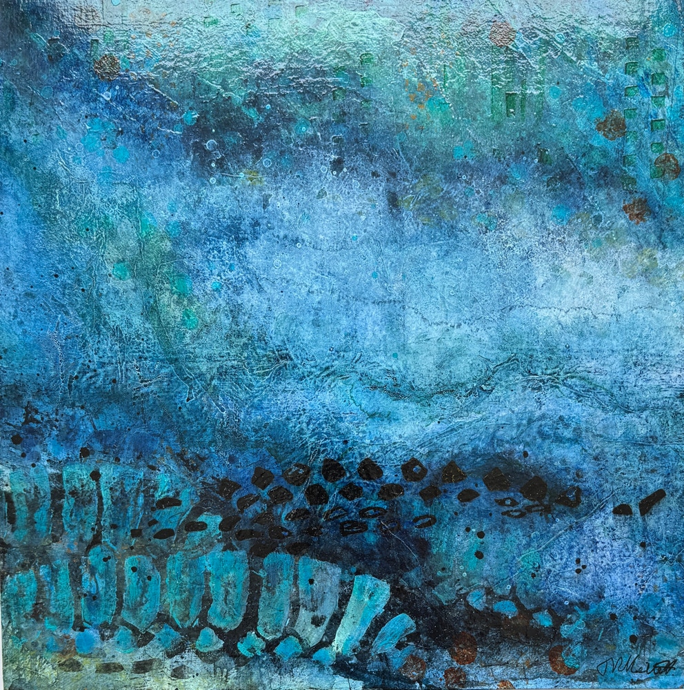 Acrylic, collage mixed media, oils on cradled pane.l. 12” x 12” (30cm x 30cm) in 2” deep maple floater frame..