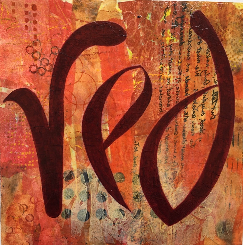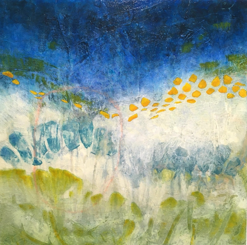 Mixed media with acrylics, oils, collage on birch wood panel 12” x 12” (30cm x 30cm) in natural maple wood frame.