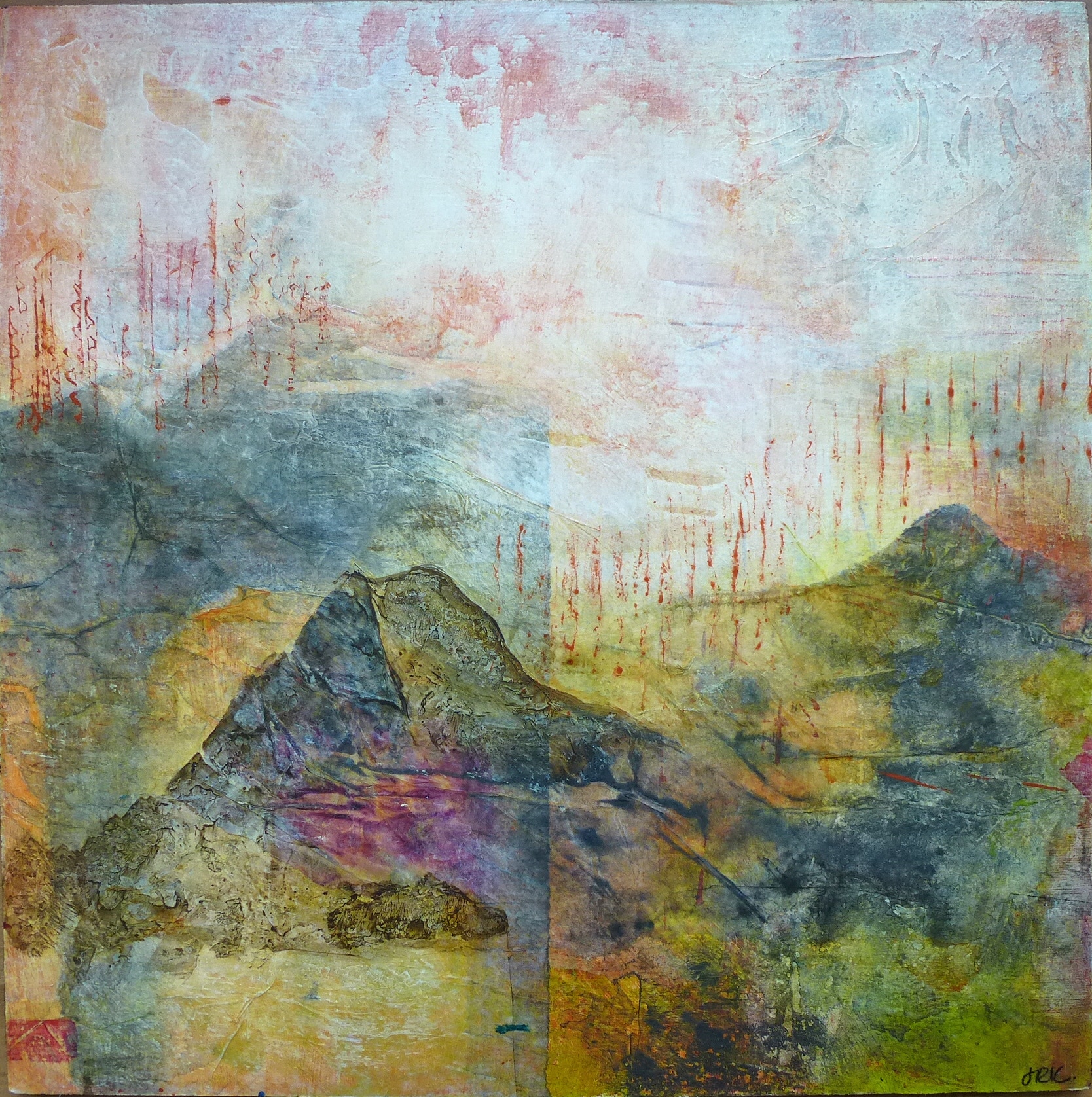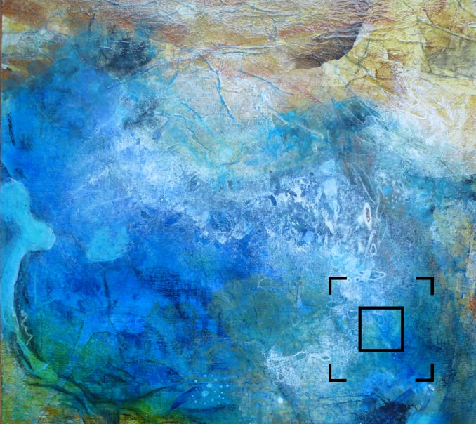 Acrylic paint with collage on birch wood panel, in dark wood floater frame. 12” x 12” (30cm x 30cm.)