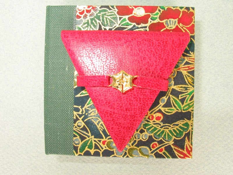 The tiny triangular book consists of a title page, a printed hand-coloured parchment hexagon and a colophon, and is contained in a rectangular book box covered in Japanese Chiyogami mulberry fibre paper screen printed in rich tones of red, green, blue and gold, and lined with black 'silk' paper. The book is bound in red goatskin and fastened with straps and a bronze rose-shaped clasp.It measures 21/8" x 21/4" x 21/4" and the box measures 2 9/16" square, 13/16" deep.